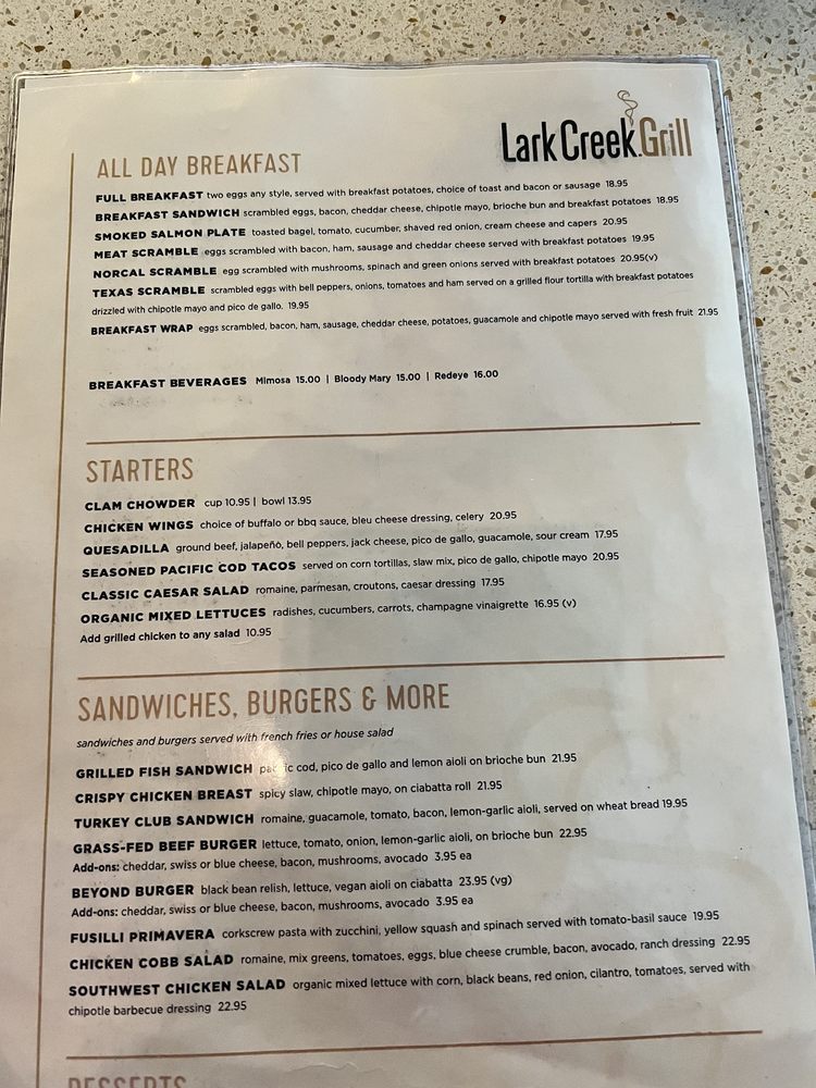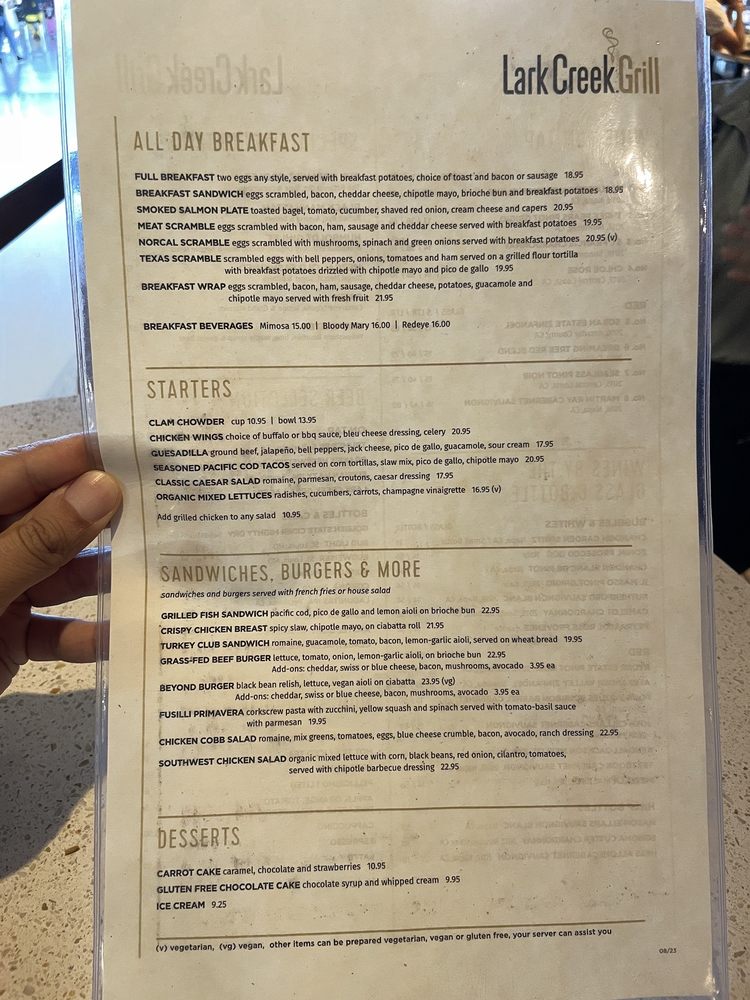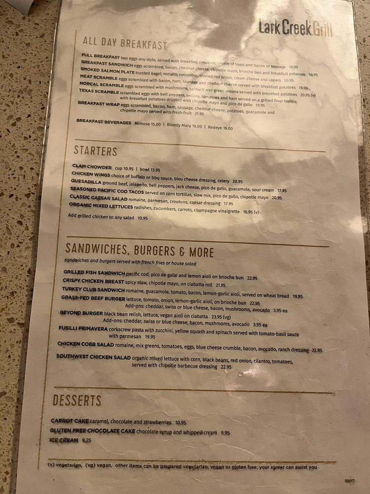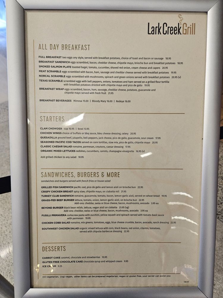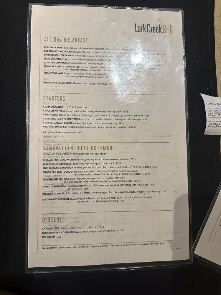 Introducing the menu at Lark Creek Grill, a café located in San Francisco Airport Terminal 2. Offering takeout, reservations, delivery, and a variety of options including vegan and limited vegetarian choices, this restaurant is a popular choice for travelers. Reviews highlight the friendly and efficient service, generous portions, and tasty dishes like the breakfast wrap, salmon plate, chicken cobb salad, and burgers. Customers praise the attentiveness of the staff, the convenience of the location, and the overall welcoming atmosphere. With options for breakfast, lunch, and dinner, as well as a full bar and outdoor seating, Lark Creek Grill provides a comfortable dining experience for all types of travelers. Don't miss out on trying their flavorful dishes and enjoying the attentive service during your next visit to SFO Terminal 2.
