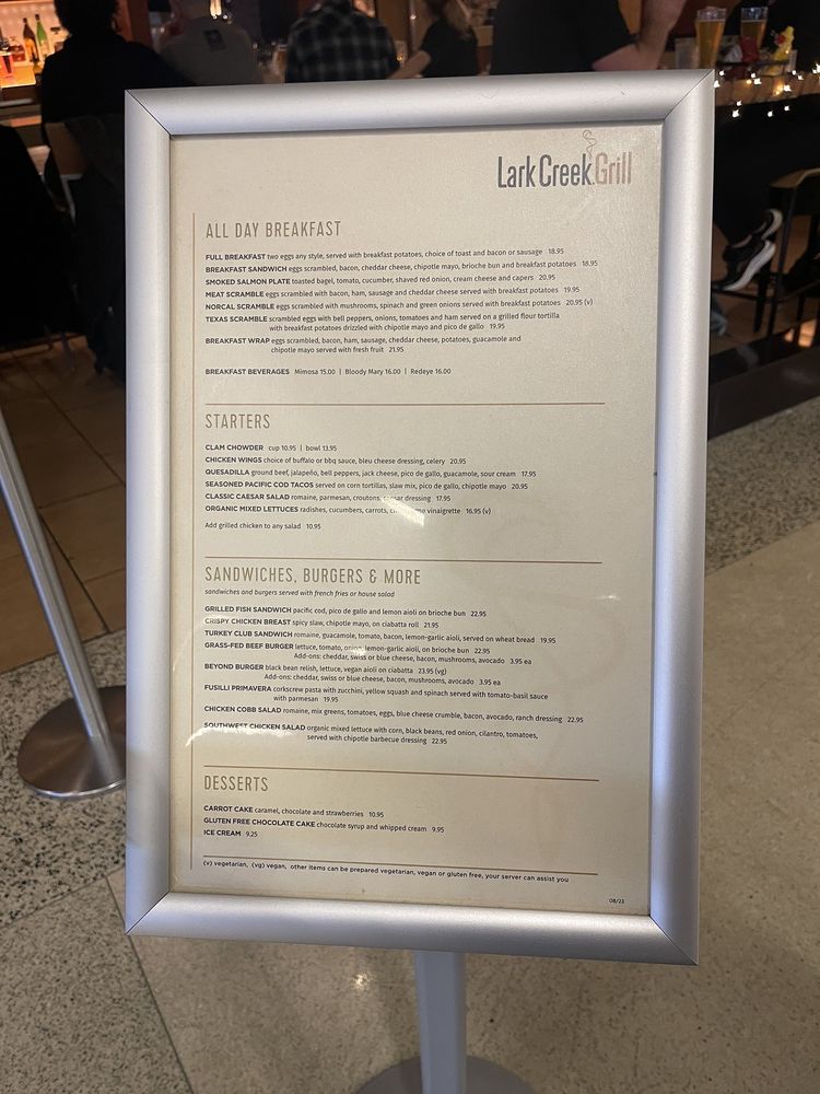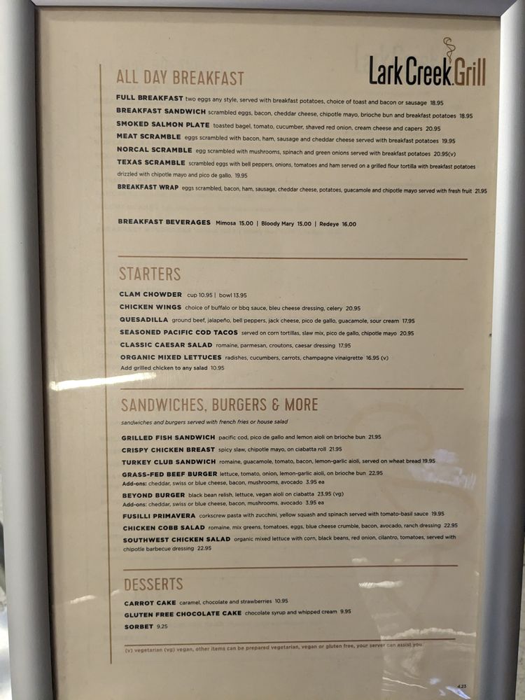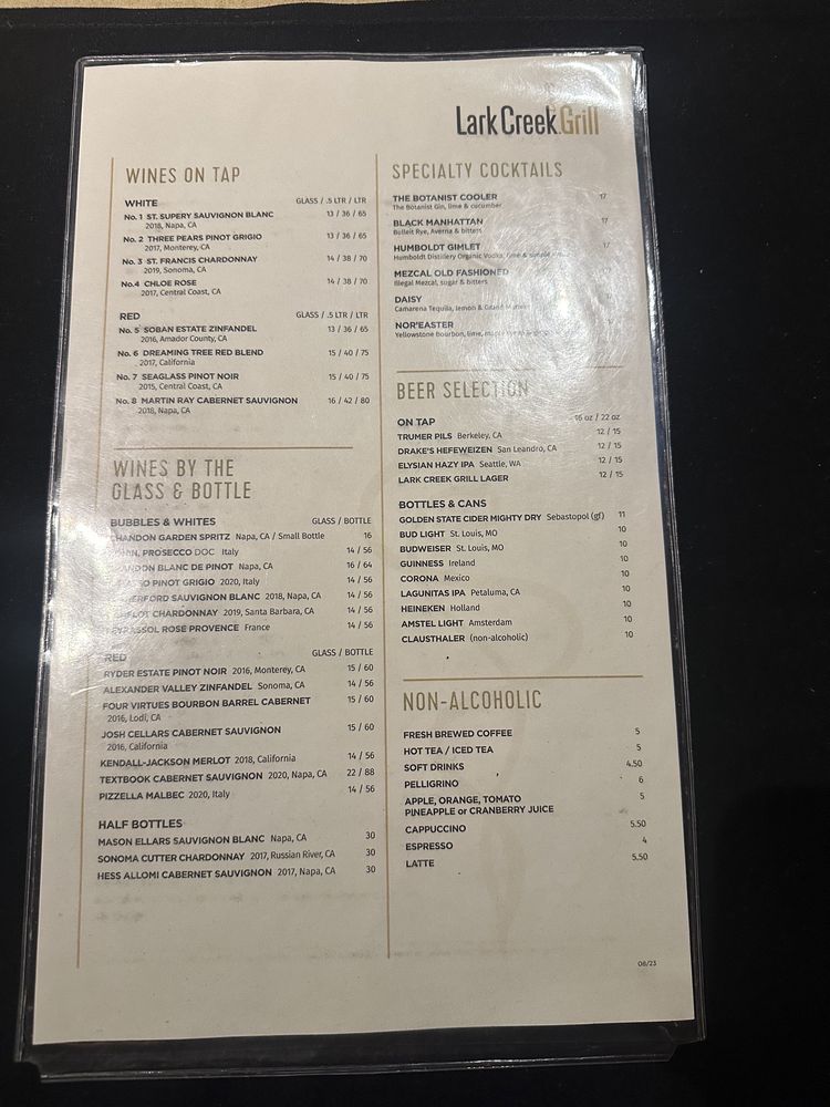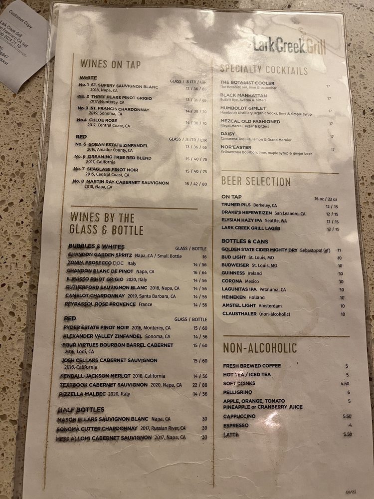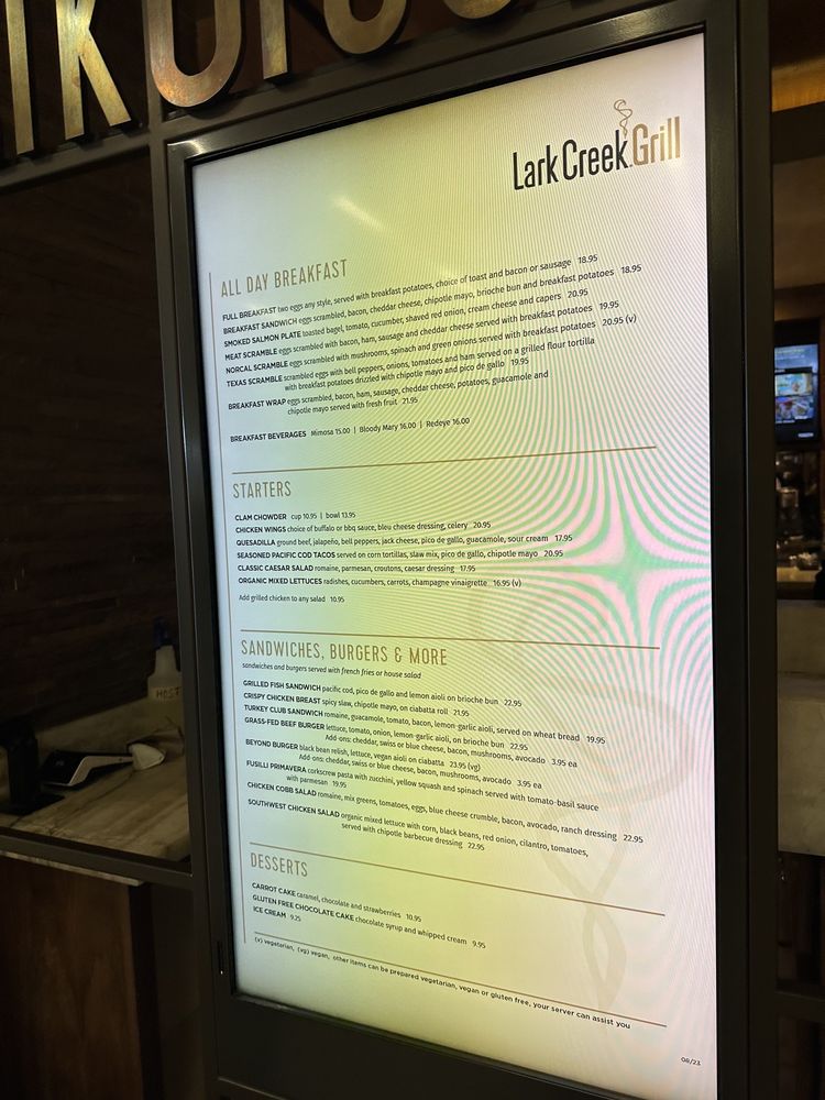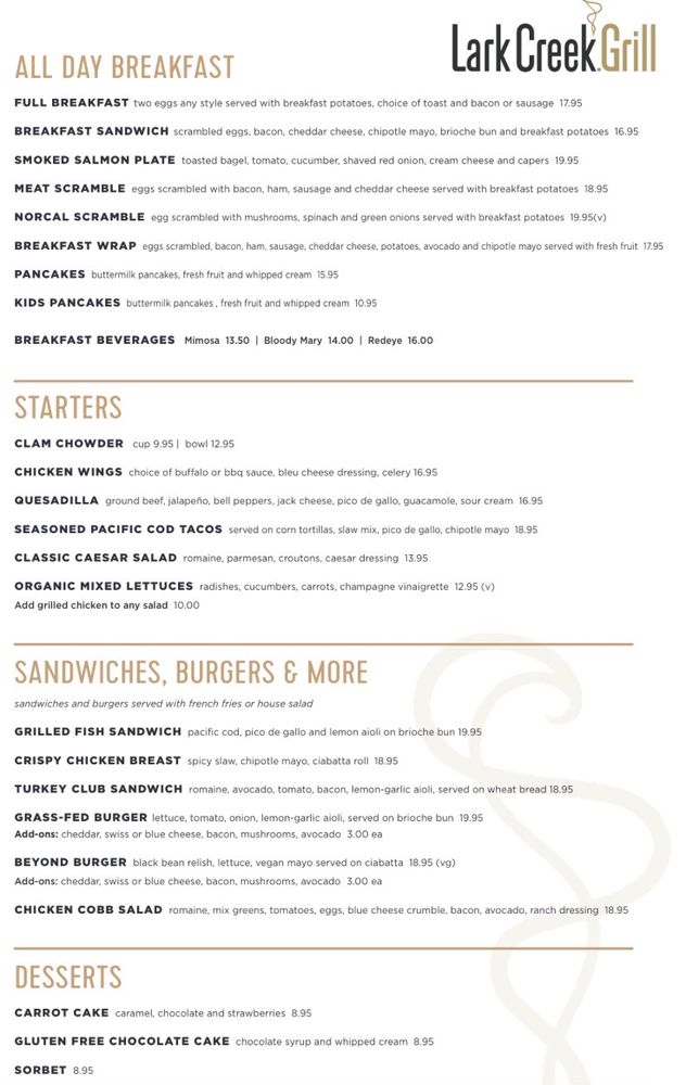 Introducing the menu at Lark Creek Grill, a café located in San Francisco Airport Terminal 2. Offering takeout, reservations, delivery, and a variety of options including vegan and limited vegetarian choices, this restaurant is a popular choice for travelers. Reviews highlight the friendly and efficient service, generous portions, and tasty dishes like the breakfast wrap, salmon plate, chicken cobb salad, and burgers. Customers praise the attentiveness of the staff, the convenience of the location, and the overall welcoming atmosphere. With options for breakfast, lunch, and dinner, as well as a full bar and outdoor seating, Lark Creek Grill provides a comfortable dining experience for all types of travelers. Don't miss out on trying their flavorful dishes and enjoying the attentive service during your next visit to SFO Terminal 2.